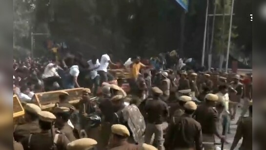 बैरिकेडिंग पर चढ़े प्रदर्शनकारी, बढ़ा तनाव